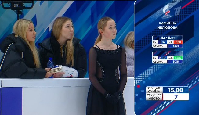 Очень неудачный четверной лутц от Камиллы Нелюбовой. Не слишком удачно сделала каскад: вышло 3 лутц + 2 риттбергер. А вот на повторе улучшила — 3 лутц + 3 риттбергер. И еще и тройной флип затем прыгнула.
