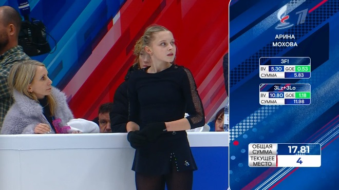 Арина Мохова делает чистый тройной флип, а затем чистый каскад 3 лутц + 3 риттбергер. Пытается улучшить каскад, но делает чуть хуже. А потом еще раз исполняет тройной флип и, видимо, немножко улучшает!