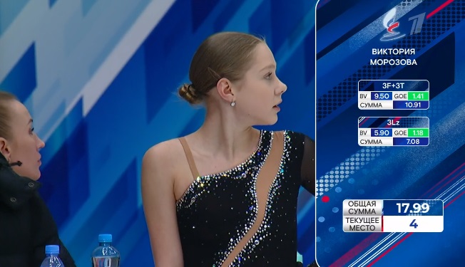 Виктория Морозова сделала чистый каскад 3 флип + 3 тулуп, а затем два раза подряд исполнила тройной лутц. Судьи выберут тот, что лучше. Ну и еще раз каскад 3 флип + 3 тулуп напоследок. С улучшением явно.