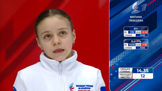 Милана Лебедева на льду и прыгает четверной сальхов — неудачное приземление немного. На попытке повтора приземляется хуже. Каскад не получается — падение на тройном лутце. Но делает со второй попытки: 3 лутц + 3 тулуп.