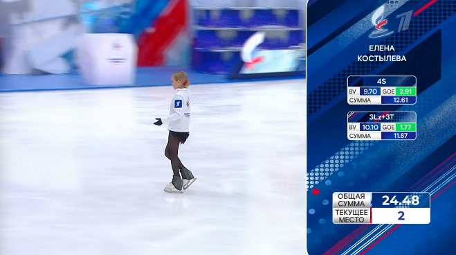 Елена Костылева неудачно приземляет четверной сальхов, но со второй попытки делает все четко! И потом каскад 3 лутц + 3 тулуп. Чисто, но пробует повторить и падает.
