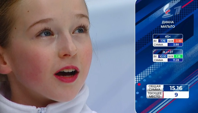 Диана Мильто падает с четверного сальхова. Со второй попытки делает его, но с недокрутом. И потом каскад 3 лутц + 3 тулуп. Неплохо, но не идеально. И затем пытается улучшить, но неудачно.