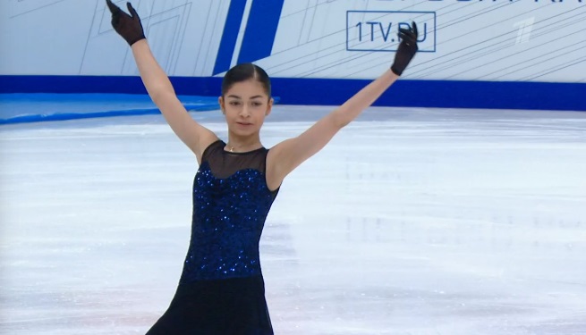 Арина Калугина заходит на четверной тулуп. Смазала приземление, но не упала. Пытается сделать четверной сальхов, но падает. На флажке делает каскад из двух тройных тулупов, но падает.