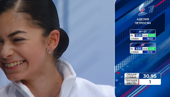 Чемпионка России Аделия Петросян прыгает сначала каскад 4 флип + 3 тулуп, а потом сольный четверной тулуп. Вообще без проблем. Даже не стала ничего перепрыгивать!