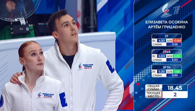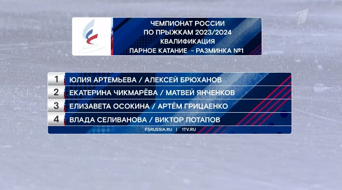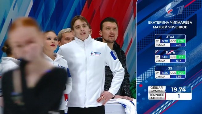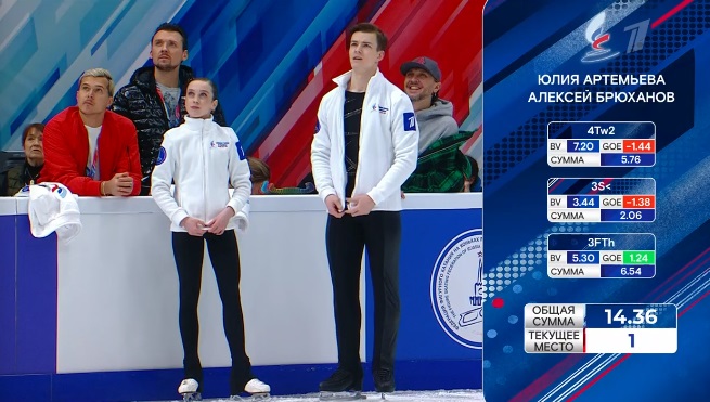 Начинают парный прыжковый турнир Юлия Артемьева и Алексей Брюханов. Сначала подкрутка в четыре оборота, хоть и не идеальная. Сделали вторую попытку — улучшили, хоть и опять не идеально. На этот раз второй уровень вместо первого. Дальше параллельный тройной сальхов не очень удачно. Ну и потом очень качественный выборс тройной флип. Ну, у пар все в финал выходят, можно не нервничать особо.