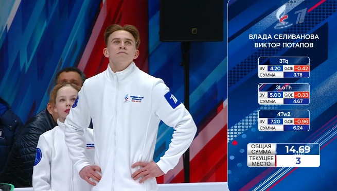 Влада Селиванов и Виктор Потапов сразу же делают четверную подкрутку, а затем выполняют параллельный тройной тулуп. Ну и выброс тройной риттбергер неплохой, но с ошибочкой на выезде.