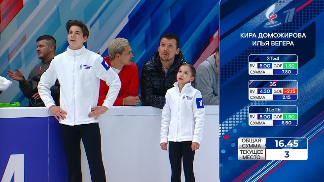 Кира Доможирова и Илья Вегера сразу же сделали очень четкую тройную подкрутку. А вот на тройном сальхове партнерша упала. И у пар нет возможности перепрыгнуть. Зато выброс тройной риттбергер получился очень далеким.