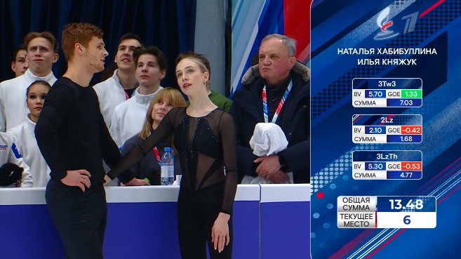 Наталья Хабибуллина и Илья Княжук сразу сделали четкую тройную подкрутку, а вот на параллельном тройном лутце партнер просто сделал двойной прыжок. Так и будет засчитано. Выброс тройной лутц напоследок сделали тоже не слишком хорошо.