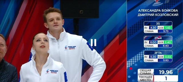 Время главных звездных пар. Александра Бойкова и Дмитрий Козловский сделали чистую тройную подкрутку четвертого уровня на хороший плюс, исполнили параллельный тройной сальхов и сделали выброс тройной флип. Все хорошо.