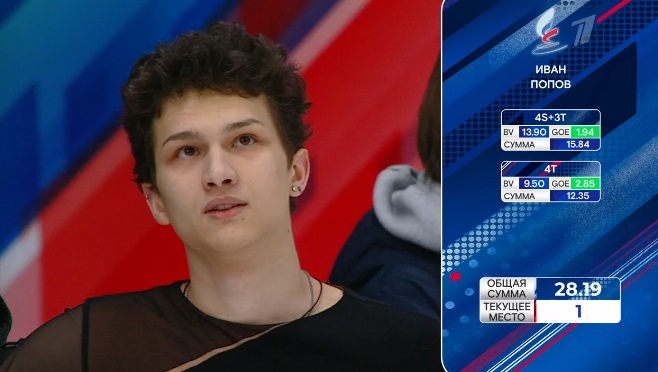 Первым выступает Иван Попов. Сразу же каскад 4 сальхов + 3 тулуп — чисто и на плюс! Ну и четверной тулуп чисто исполнил! Даже ничего перепрыгивать не стал.