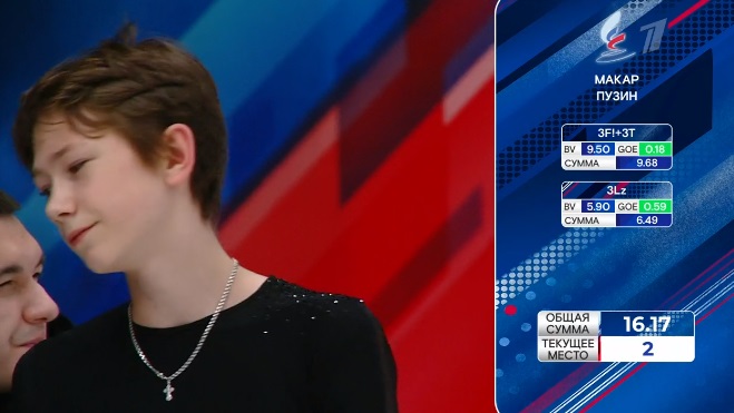 Макар Пузин не докрутил и упал с тройного акселя. Дальше сделал каскад 3 флип + 3 тулуп. В качестве перепрыжки сольного прыжка исполнил 3 лутц. Ну и затем добавил еще каскад 3 флип + 3 риттбергер, чтобы поднять стоимость.