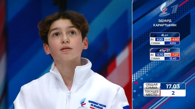 Эдуард Карартынян падает с тройного лутца. И еще раз, уже с четверного. Дальше заходит на каскад, но получается двойной тулуп, и он не продолжает. И все же на финише делает каскад 4 тулуп + 3 тулуп. Это вот было хорошо.
