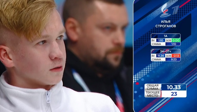 Илья Строганов прыгает каскад 3 аксель + 3 тулуп со второй попытки. Причем первая попытка была засчитана как одинарный аксель. Ну и затем он лутц неудачно прыгает — только двойной. И больше нет попыток сольных прыжков.