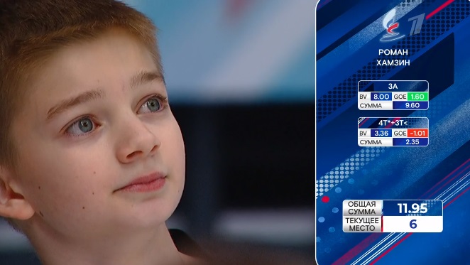 Роман Хамзин сразу же уверенно прыгает тройной аксель. Дальше попробовал четверной тулуп, но приземлил на две ноги. И тут же делает каскад 4 тулуп + 3 тулуп! На выезде ошибочка, но не критичная.