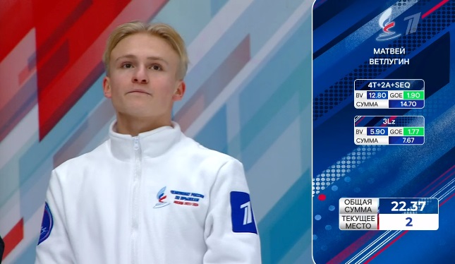 Матвей Ветлугин сразу пытается сделать четверной риттбергер, но крайне неудачно. Дальше исполняет каскад 4 тулуп + 2 аксель. Неплохо. Ну и вторая попытка сольного прыжка. Это тройной лутц — чисто.