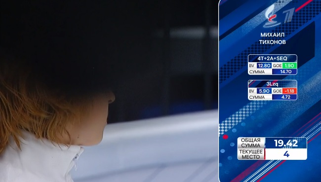 Михаил Тихонов первым делом исполняет каскад 4 тулуп + 2 аксель. А вот на сольном четверном сальхове падает. Есть время на еще одну попытку. Он ее делает — только тройной лутц. Еще и не самый блестящий.