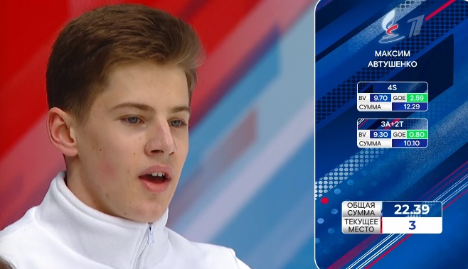 Максим Автушенко очень четко сразу прыгает четверной сальхов. Пошел на сложный каскад, но сорвал. Получился перекидной прыжок. Повторил и сделал каскад 3 аксель + 2 тулуп.