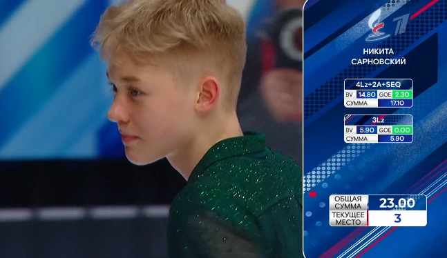 Никита Сарновский прыгает каскад 4 лутц + 2 аксель. Дальше срывает сольный прыжок. Но в итоге делает тройной лутц.