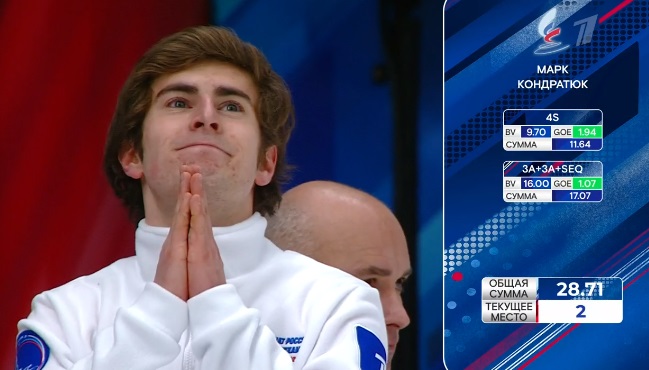 Именитый Марк Кондратюк падает с четверного лутца, но делает чисто четверной сальхов! И затем присоединяет каскад из двух тройных акселей! Чисто!