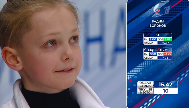Вадим Воронов прыгает тройной аксель — чисто. А вот на четверном тулупе в начале каскаде не удержался на ногах, но присоединил двойной аксель. При второй попытке того же каскада тоже упал на четверном тулупе. И тоже аксель добавил. Ну хоть что-то.