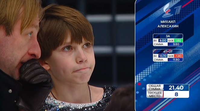 Юный Михаил Алексахин сразу делает тройной аксель! Но это не все: дальше неплохой каскад 4 тулуп + 3 тулуп. Правда со второго прыжка плоховато выехал. Упал при попытке перепрыгнуть ученик Плющенко.