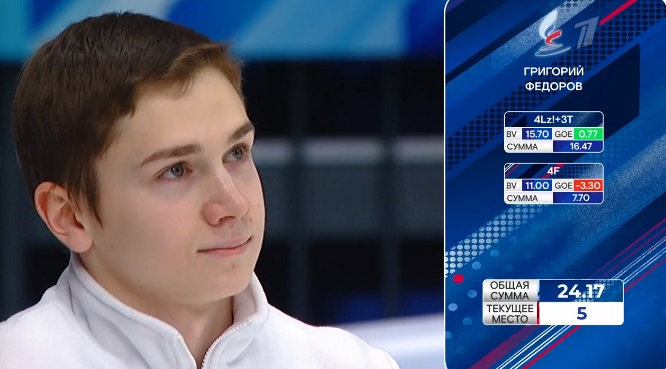 Чемпион России по прыжкам Григорий Федоров сразу же делает 4 лутц + 3 тулуп. А вот на четверной флип не смог зайти. Но со второй попытки сделал четверной флип. Докрученный, но с неудачным выездом.