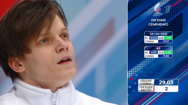 Евгений Семененко прыгает каскад из двух тройных акселей — успешно. Срывает аксель, ориентируется и добавляет к нему прыжок, чтобы сжечь второй каскад. Тулуп четверной тоже не получается, зато получается четверной сальхов.