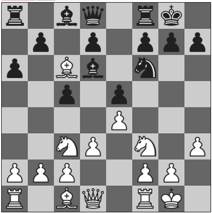 1.e4 c5 2.Nf3 Nc6 3.Bb5 e5 4.0-0 Bd6 5.d3 Nf6 6.Nc3 0-0 7.h3 a6 8.Bxc6 dxc6 9.Nh4 Re8 10.Qf3 g6 11.Bg5 Be7 12.Qe3 Nh5 13.Bxe7 Qxe7 14.Nf3 b6 15.a3 b5 16.Ne2 f6 17.Nd2 Be6 18.f4 Nxf4 19.Nxf4 exf4 20.Rxf4 Rad8 21.Qf2 Rf8 22.Rf1 Kg7 23.b4 cxb4 24.axb4 Ra8.