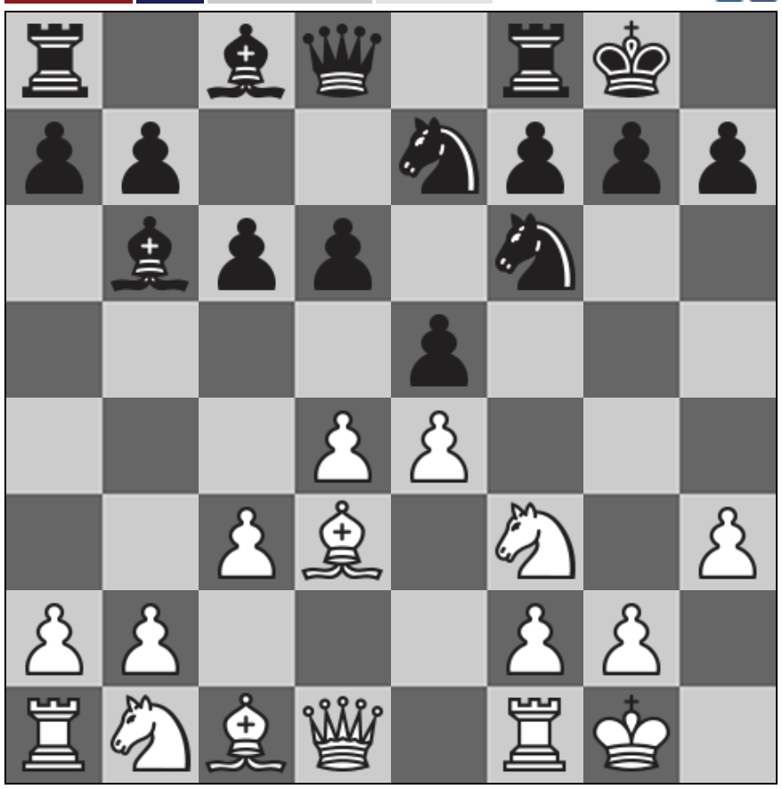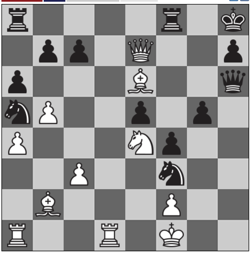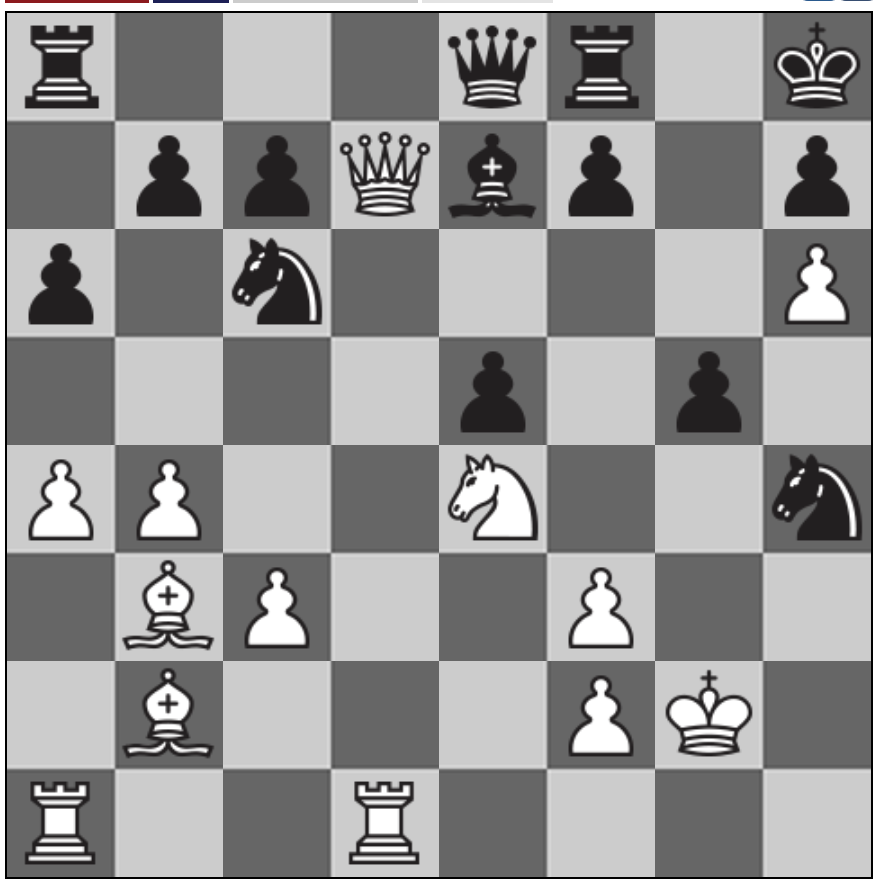 Оглянемся на другие доски. Не в лучшем положении сейчас Прагнанандха, но у него еще больше 50 минут. 1.d4 d5 2.c4 e6 3.Nf3 Nf6 4.g3 Bb4+ 5.Nc3 dxc4 6.Bg2 0-0 7.0-0 Nc6 8.a3 Be7 9.e4 a6 10.Be3 b5 11.Qe2 Bb7 12.Rad1 Na5 13.d5 exd5 14.e5 Ne8 15.e6 f5 16.Ne5 Nf6 17.Qc2 c6 18.Qxf5 Qe8 19.Nf7 Bc8 20.Rf1.