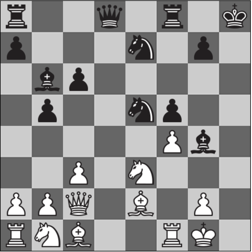 А Накамура пытается атаковать, пока компьютер дает 0,4 в пользу Гуджрати. 1.e4 e5 2.Nf3 Nc6 3.Bb5 Nf6 4.d3 Bc5 5.c3 0-0 6.0-0 d6 7.h3 Ne7 8.d4 c6 9.Bd3 Bb6 10.dxe5 dxe5 11.Nxe5 Bxh3 12.Nc4 Bg4 13.Qc2 Bc7 14.e5 Nd7 15.Bxh7+ Kh8.