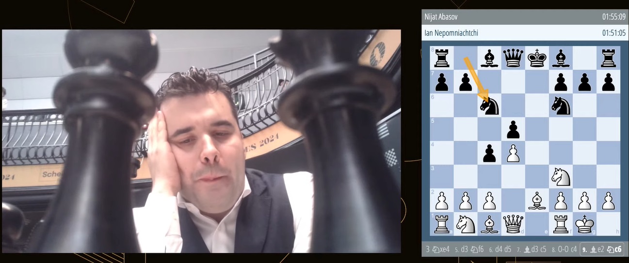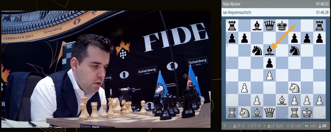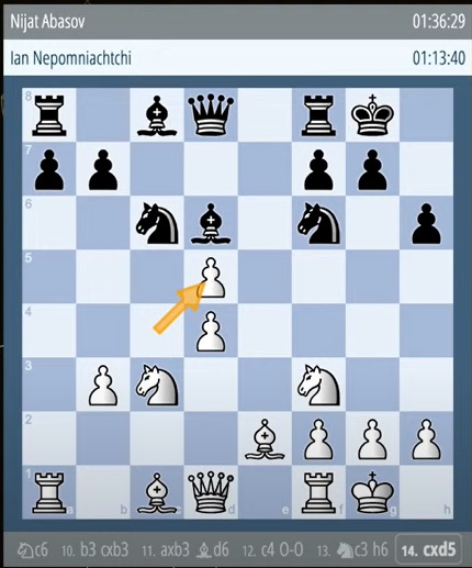 Непомнящий не стал делать шах, а Абасов двинул коня на с6. Вероятно, Ниджат пока просто пытается понять, какую комбинацию собирается разыграть соперник.