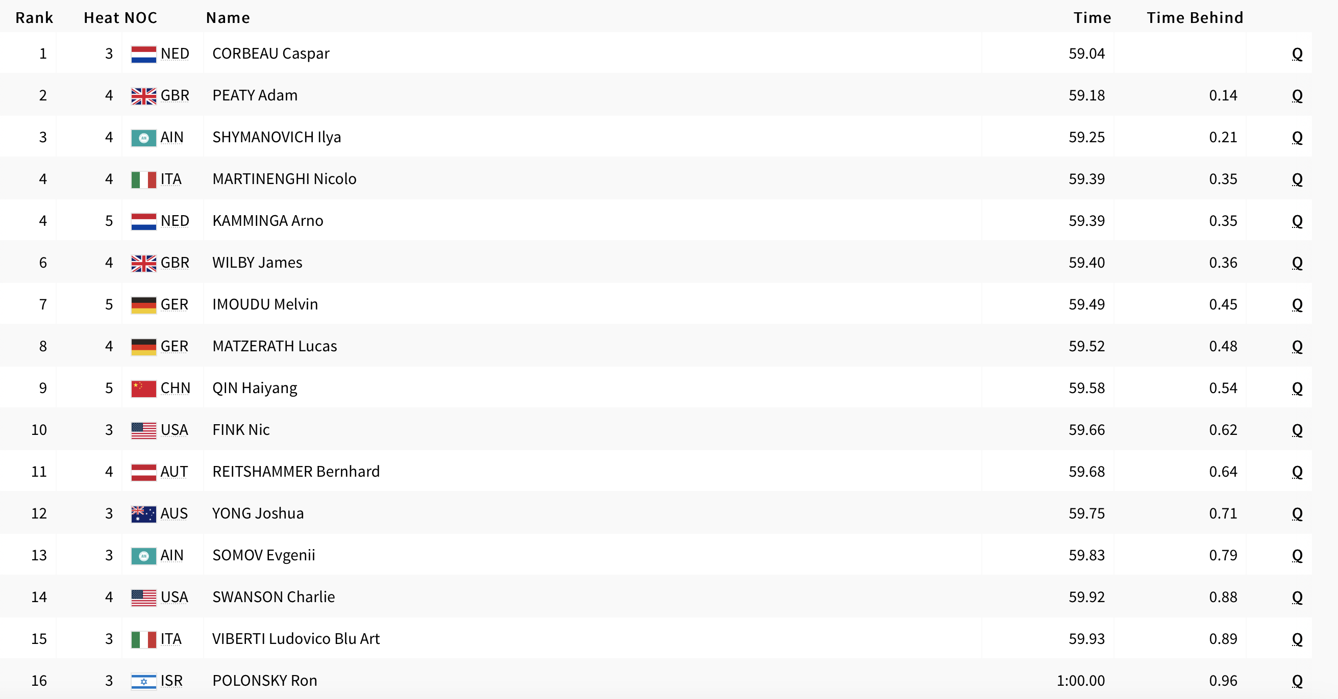 Сомов прошел дистанцию четвертым в своем заплыве с результатом 59,83. С таким показателем он должен попадать в число 16 участников полуфинала. Еще два заплыва впереди. И в ближайшем заплыве поддержим белоруса Илью Шимановича, который также выступает в нейтральном статусе.