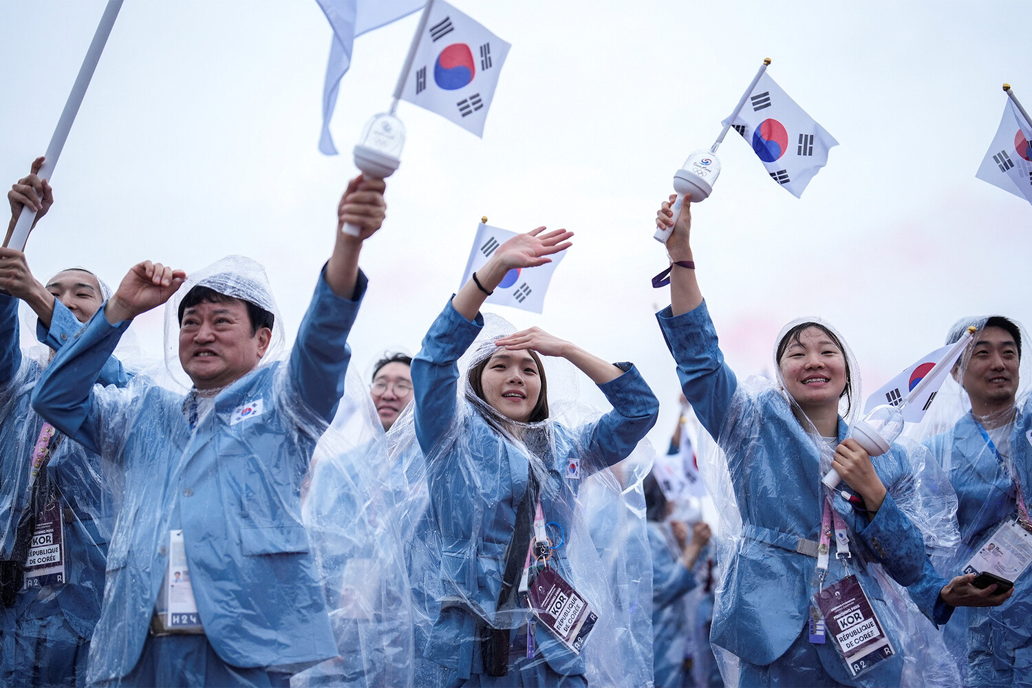 Спортсмены из Южной Кореи во время парада на реке Сена на церемонии открытия Олимпиады в Париже, 26 июля 2024 года