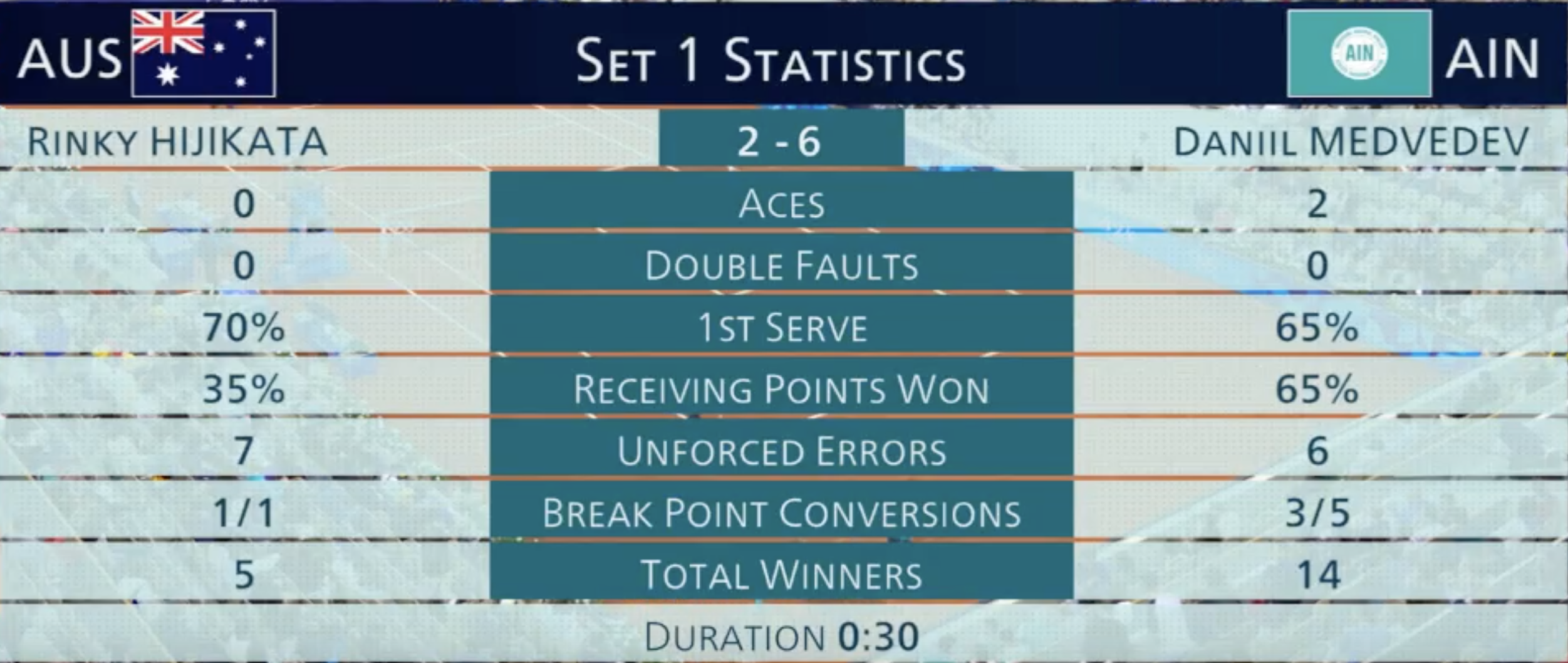 30:0. Отлично Ринки сыграл в противоход, россиянин еще и чуть поскользнулся на влажном грунте.