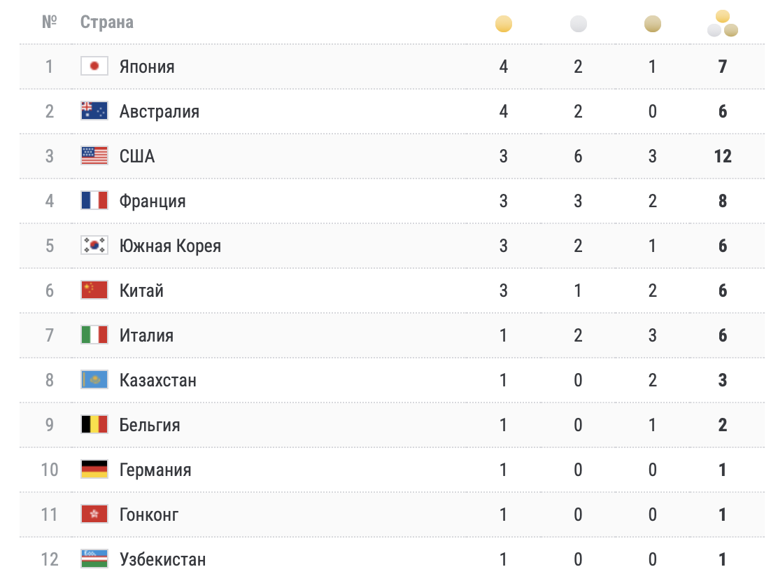 На втором месте располагается Южная Корея, имея в активе три золотые медали. Также у корейцев два серебра и бронза. У Китая, котрый замыкает тройку, три золота серебро и бронза.