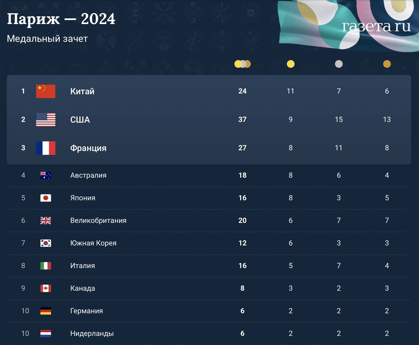 Информация о церемонии закрытия. Как сообщает TMZ, в ней примет участие голливудский актер Том Круз. Предполагается, что он сможет символично передать Игры Лос-Анджелесу — там Олимпиада пройдет в 2028 году.