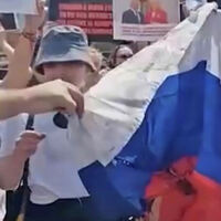Кроме того, протестующие демонстративно сожгли российский флаг и топтали его.
