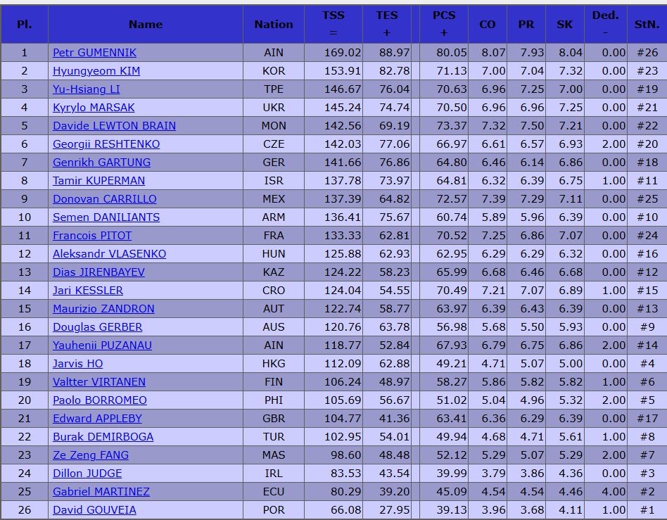 Ю Сянь Ли из Китайского Тайбэя представил свою произвольную программу. Просто великолепное выступление показал спортсмен, почти все прыжковые элементы в зеленой зоне, что позволило ему улучшить собственный рекорд почти на 10 баллов! С итогом в 146,67 балла Ли оказывается на первой позиции!