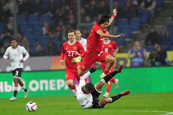Гости играли старательно, но и у сборной России желание зашкаливало. Садулаев воткнулся шипами в икру сопернику на первых минутах, но был прощен арбитром – не получил даже карточки. В середине тайма, проскочив у чужой штрафной мимо мяча, в соперника в подкате сзади влетел проводивший вторую игру за сборную и первую в старте защитник «Балтики» Мингиян Бевеев – желтая карточка тут выглядит довольно либеральным решением арбитра.
