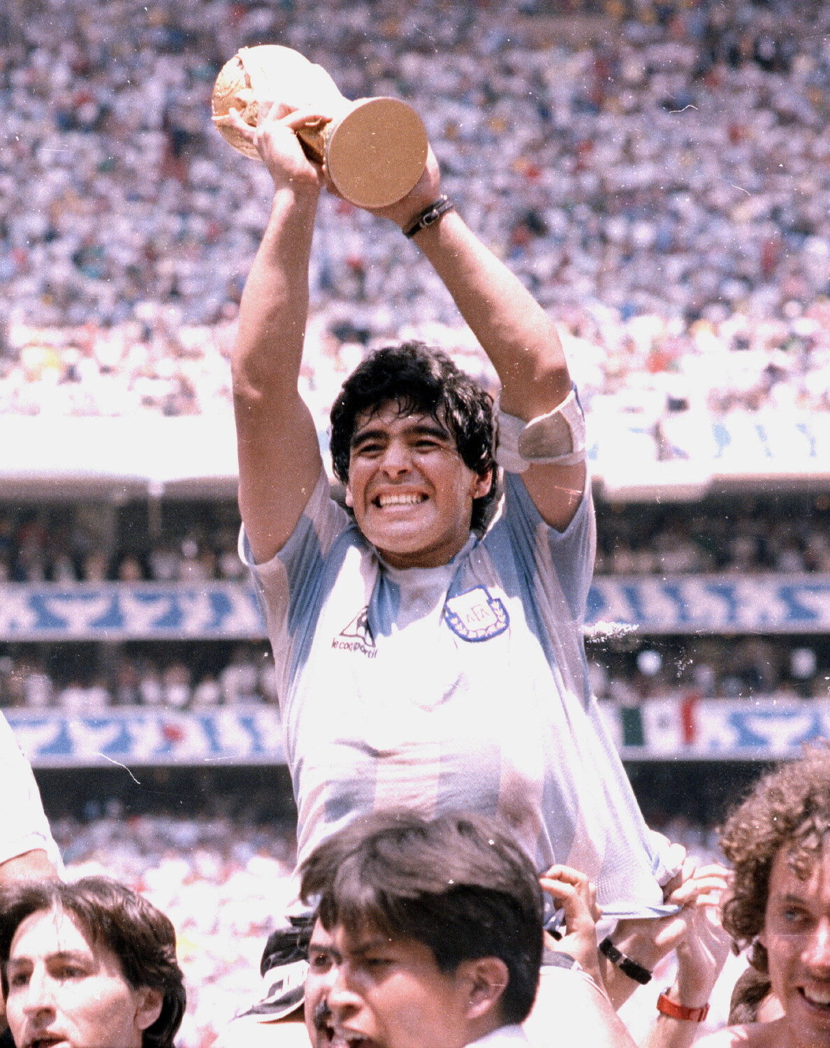 Центральный нападающий Диего Марадона держит трофейный кубок сборной Аргентины, победившей в финале чемпионата мира по футболу, Мексика, 1986 год