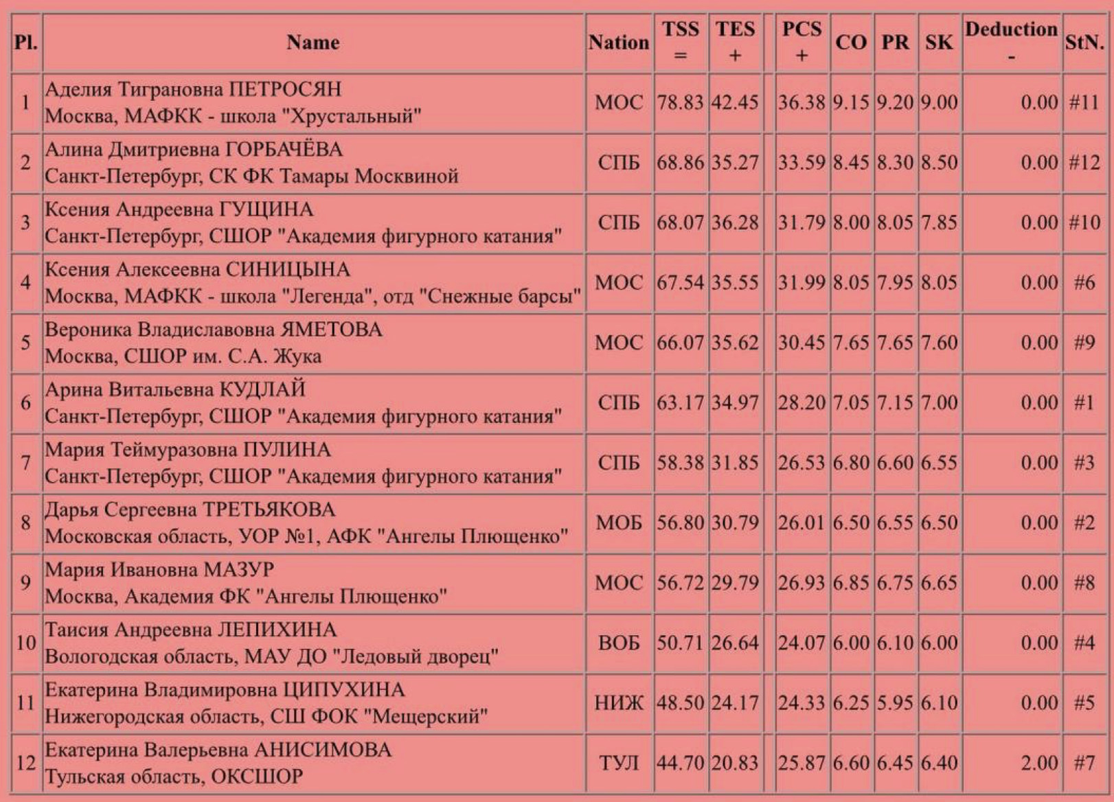 Оценка Синицыной за короткую программу — 67,54 балла. Она становится промежуточным лидером турнирной таблицы с отрывом в четыре балла от ближайшей преследовательницы — Арины Кудлай.