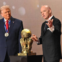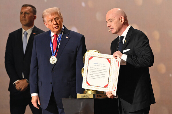 Джанни Инфантино вручает Дональду Трампу специально учрежденный приз — приз мира ФИФА! Аериканский президент получает статуэтку и золотую медаль, которую вполне можно будет принять как медаль за победу на предстоящем турнире.