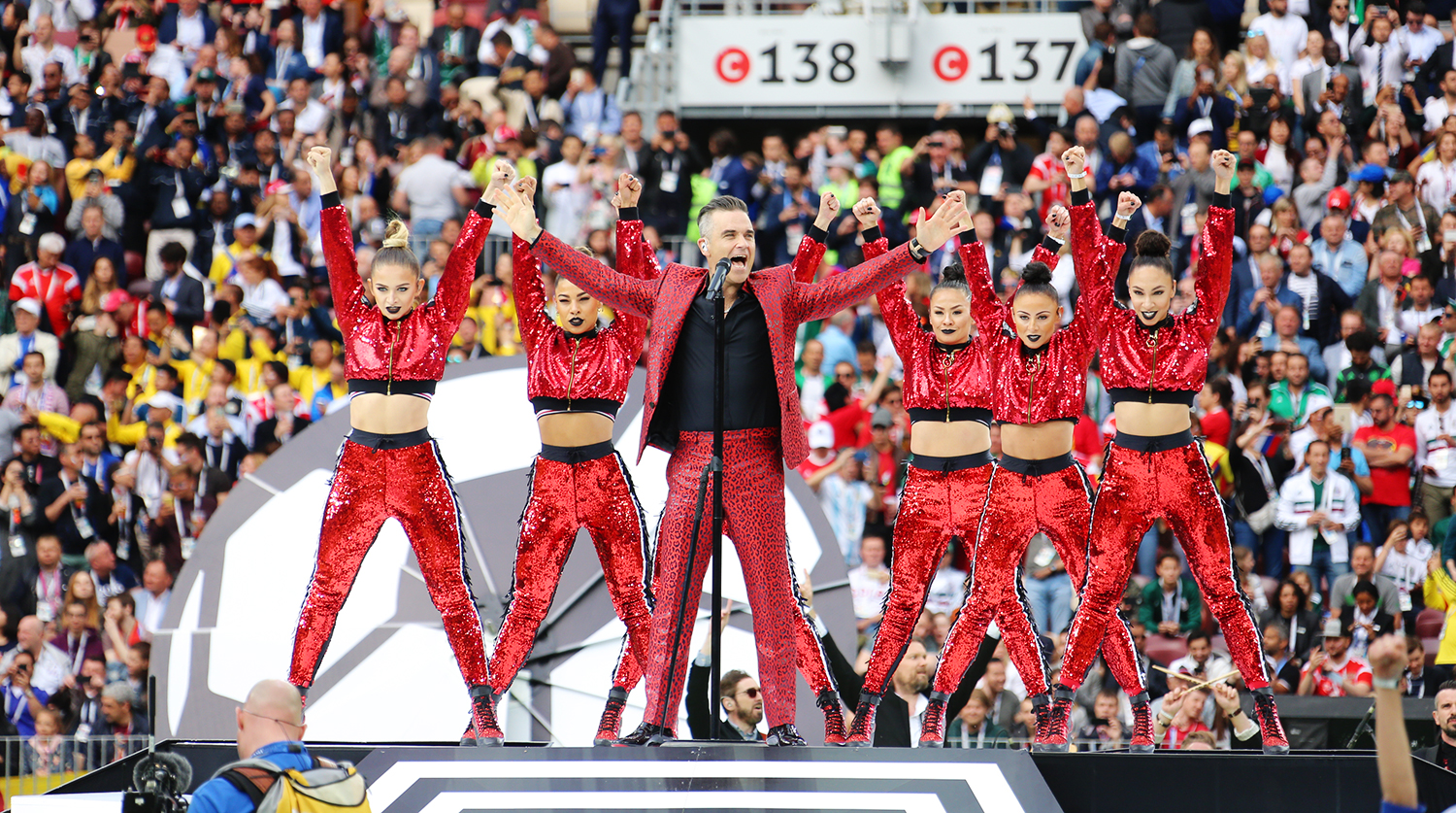 На сцене наш старый знакомый — Робби Уильямс! Именно он открывал мировое первество 2018 года в России, выступив на матче-открытии в Лужниках! А сейчас он представляет заглавную песню ЧМ-2026!