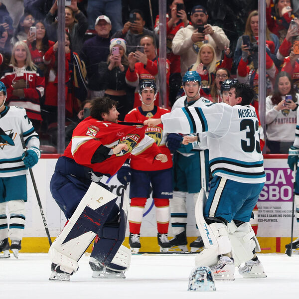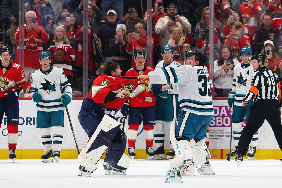 И очередной матч сложился для «пантер» не лучшим образом. На своем льду они проиграли «Сан-Хосе», пропустив во втором периоде три шайбы меньше чем за шесть минут. А самым ярким эпизодом встречи стала драка двух вратарей: Бобровского и Алекса Недельковича.