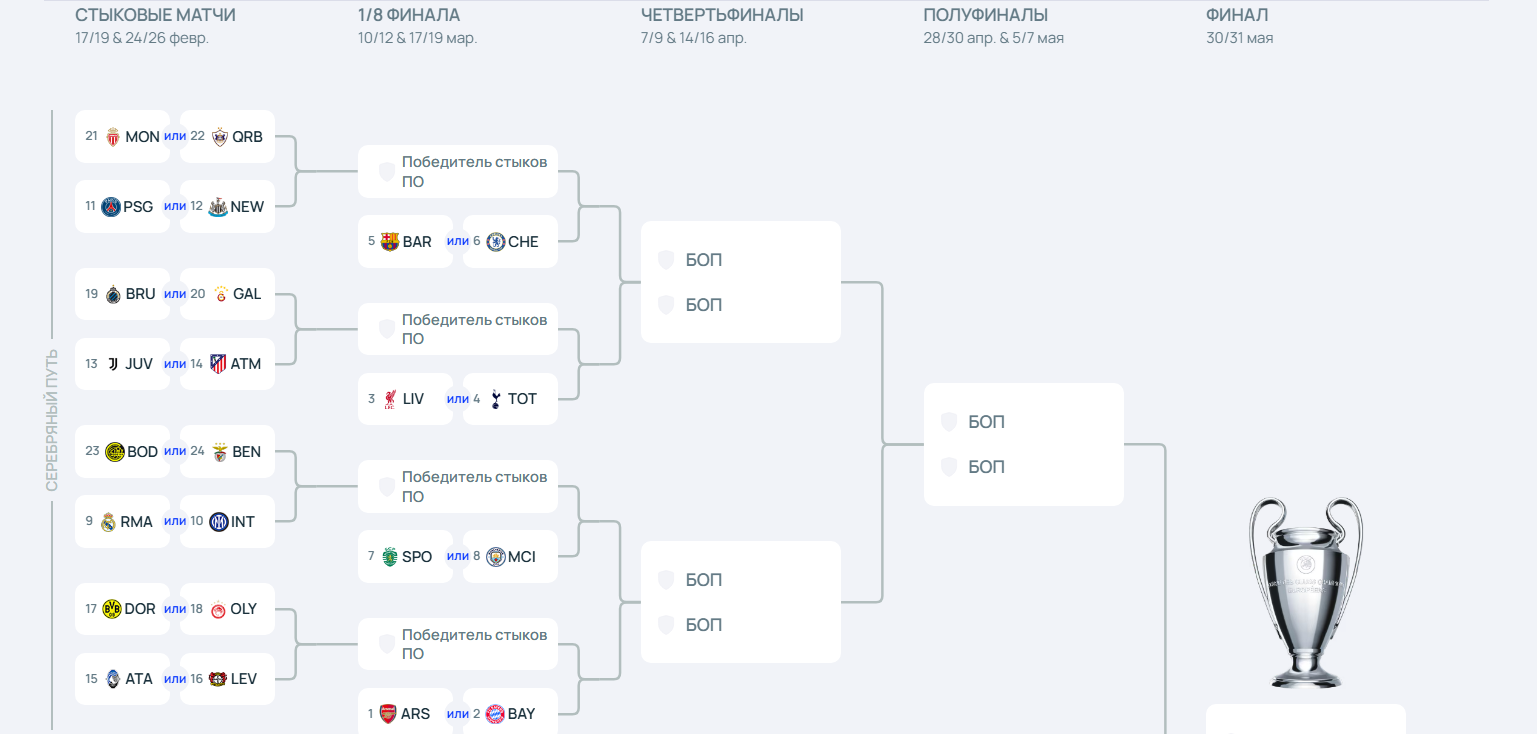 По итогам группового этапа была сформирована турнирная сетка — команды разбились на серебряный и синий пути. Через несколько минут мы узнаем, кто именно в какую сетку попадет, и кто с кем сыграет в стыковых матчах Лиги чемпионов.