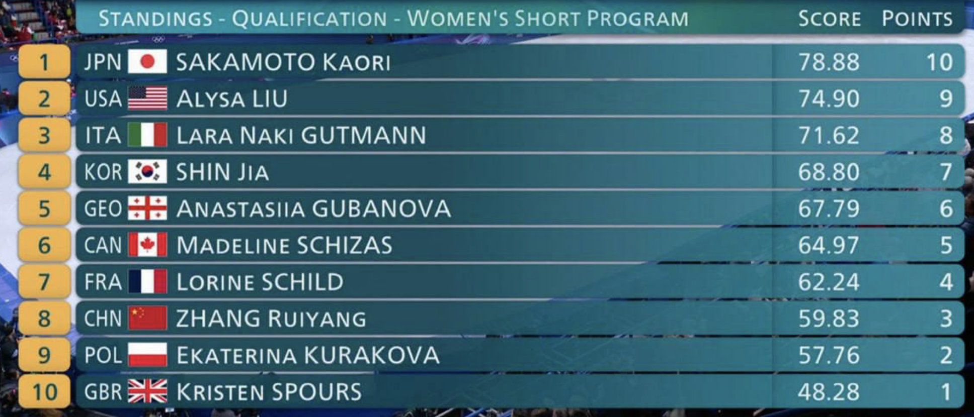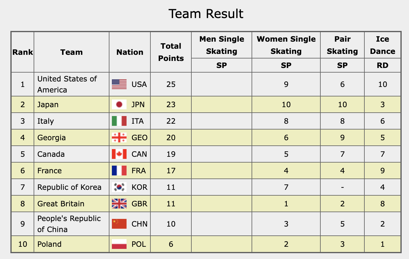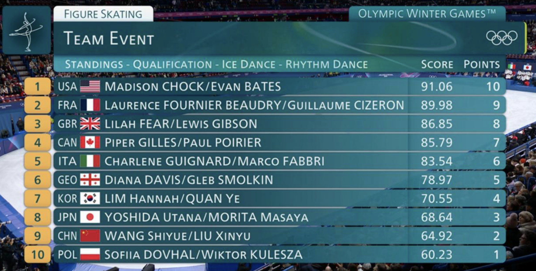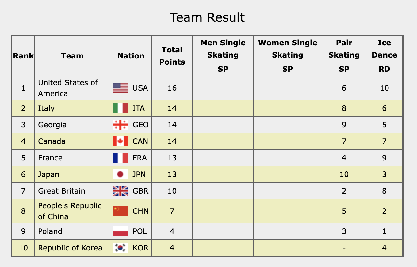 Напомним правила командного турнира: в короткой программе выступают 10 команд, а в произвольную проходят только пять. Команды могут провести две замены фигуристов между короткой и произвольной программами. Спортсмены получают за свои прокаты баллы, которые затем переводятся в очки: за первое место даются 10 очков, за второе — девять, за третье — восемь и так далее. После этого очки, заработанные всеми фигуристами команды во всех программах, суммируются, и выявляются победитель и призеры Олимпийских игр.