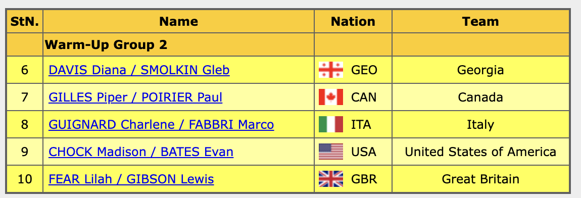 На разминку вышла вторая группа выступающих, среди которых — бывшая российская пара Диана Дэвис и Глеб Смолкин, которые теперь выступают за Грузию.