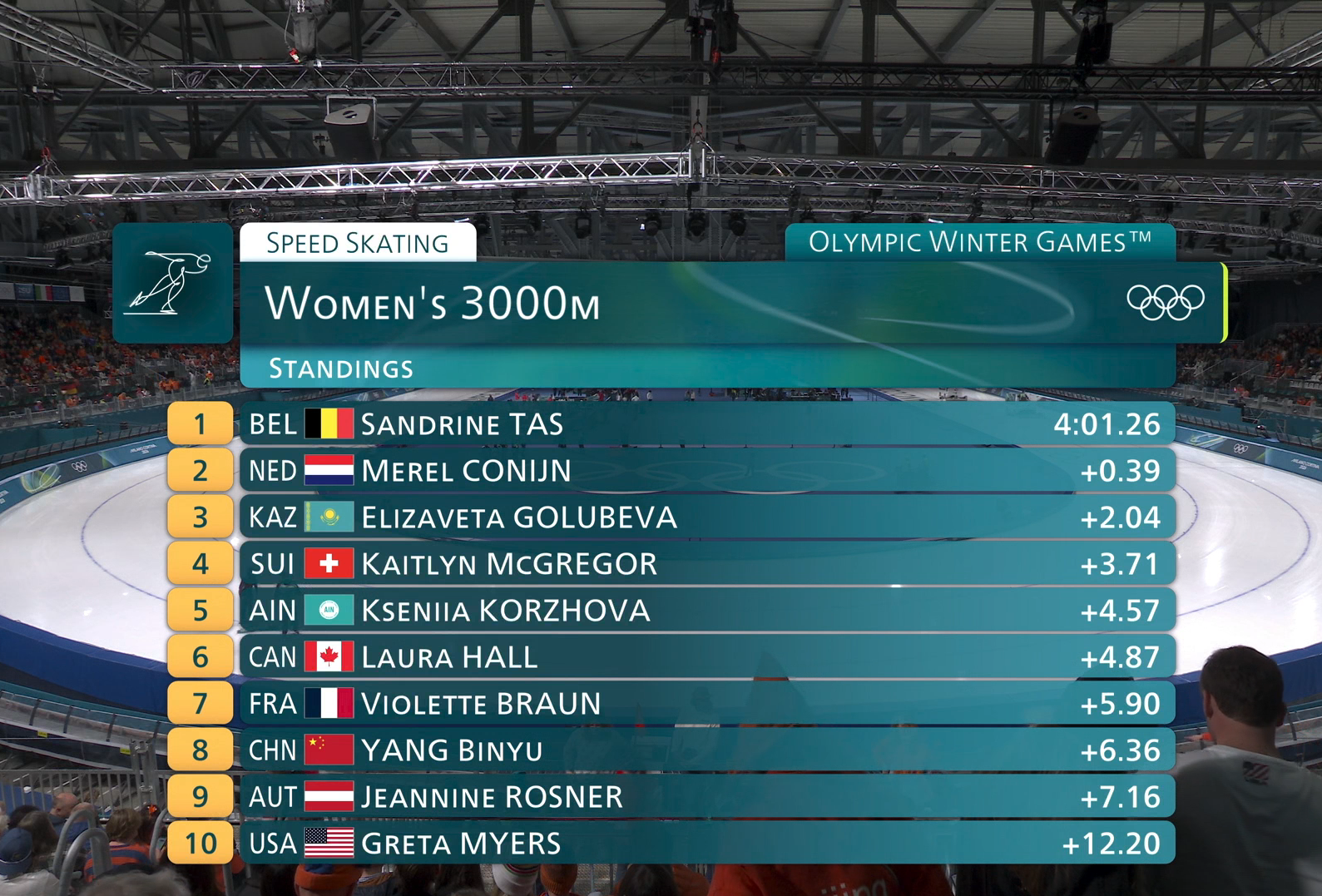 Начинается турнир конькобежек на дистанции в 3000 метров, первый заезд выиграла канадка Лаура Холл, преодолев дистанцию за чуть более чем четыре минуты.
