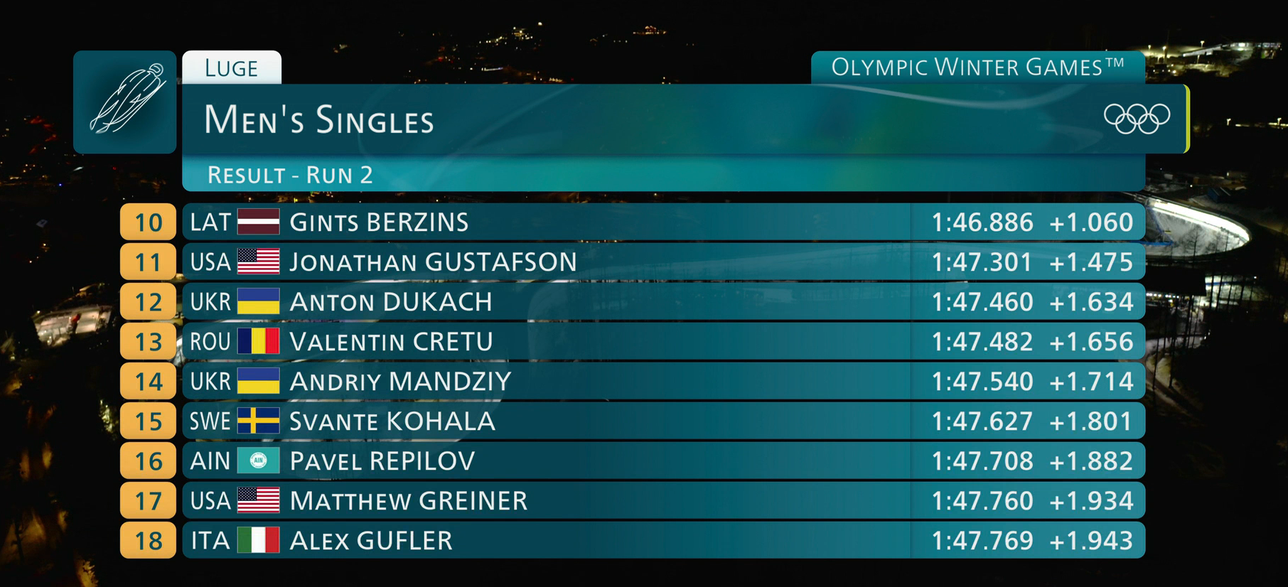 19:00 и 20:32. Первая и вторая попытки в одноместных санях у мужчин. Ждем выступлений Павла Репилова.