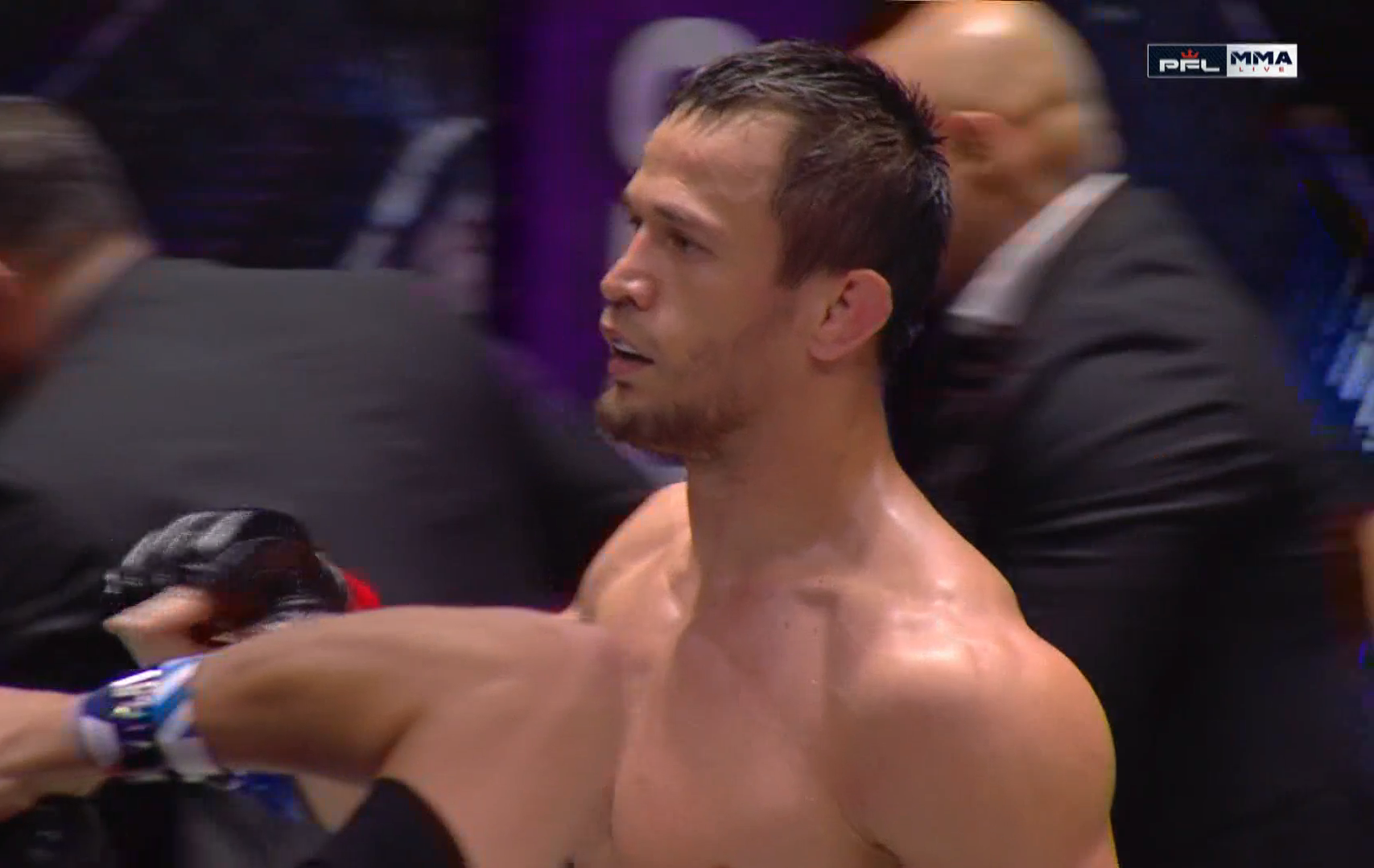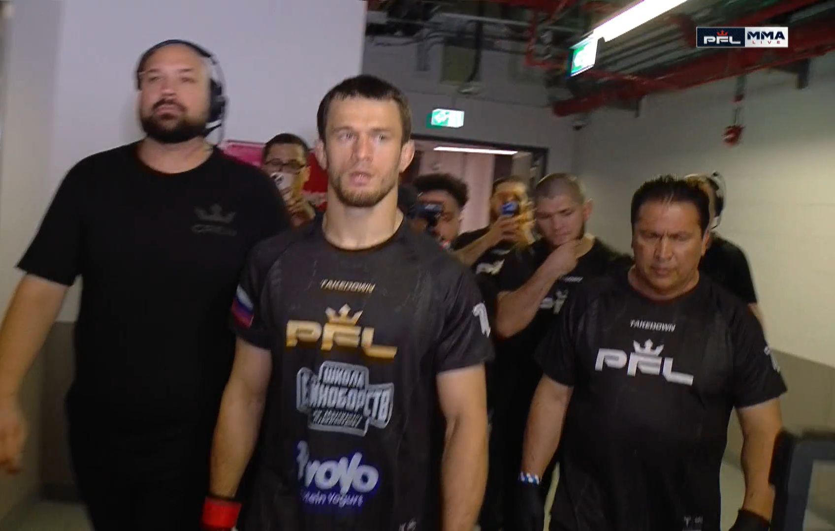 А мы переходим к главному бою вечера! В октагон выходит Усман Нурмагомедов — вместе с ним его тренерский штаб, а также Хабиб Нурмагомедов!